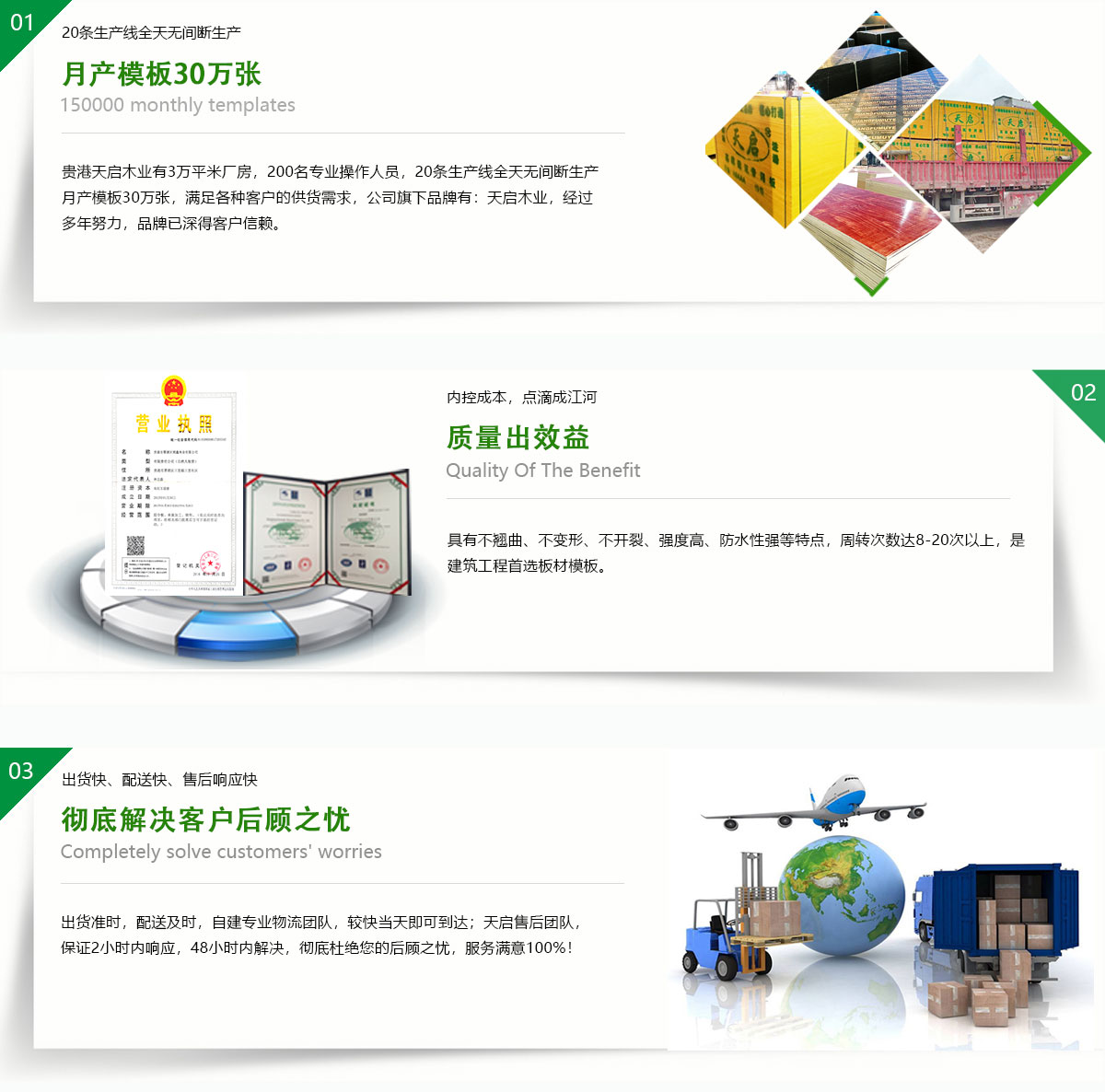 獨有對模板快速拆裝、重復使用、脫模效果好等優(yōu)勢;天啟木業(yè)模板高端質造的外表之下藏著一顆強大的實用匠心!